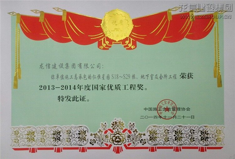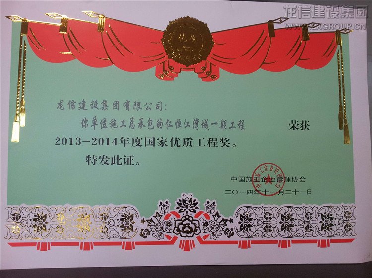 近日公司承建的“仁恒星園S18~S29棟、地下室及會(huì)所”、“仁恒江灣城一期工程”喜獲2013-2014年度“國(guó)家優(yōu)質(zhì)工程獎(jiǎng)”,子公司江蘇紫浪裝飾裝璜有限公司承建的海門市東恒盛國(guó)際大酒店裝飾工程獲“2013-2014年度全國(guó)建筑工程裝飾獎(jiǎng)”。