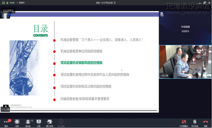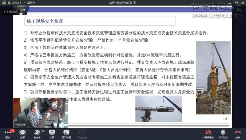 2021年4月17日上午,龍信集團(tuán)一分公司建筑大型機(jī)械安拆施工網(wǎng)絡(luò)視頻培訓(xùn)會(huì)在東方城市大廈16樓舉辦。一分公司工程部相關(guān)人員、區(qū)域工程部經(jīng)理、安全主管、設(shè)備主管、技術(shù)主管、項(xiàng)目經(jīng)理、項(xiàng)目安全負(fù)責(zé)人、機(jī)管員及技術(shù)負(fù)責(zé)人等240多人參加了此次培訓(xùn)。