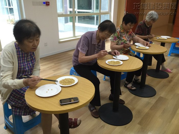 第一個比賽項目是筷子夾黃豆。裁判一聲“開始”,叔叔阿姨們便迅捷地舞動起手中的筷子,全神貫注地為這些豆子“搬家”。大部分的豆子拗不過叔叔阿姨們手中的筷子,乖乖的躺在了紙盤里。當然,也不乏一些調(diào)皮的豆子,趁大家不注意,滑落到地上,引來圍觀長者們的陣陣笑聲。比賽分7輪進行,最后,505室的何阿姨、508室的俞阿姨、809室的趙叔叔、1001室的袁阿姨、1201室的葉阿姨、1209室的張阿姨、1301室的陸阿姨分獲各輪的第一名。