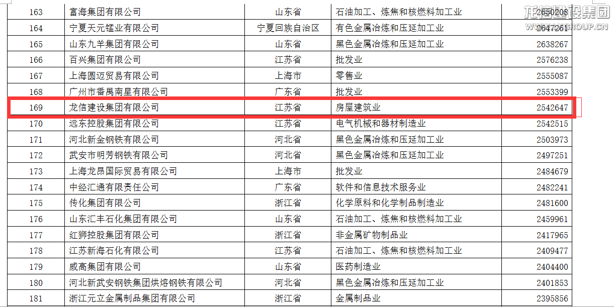 8月25日,由全國(guó)工商聯(lián)發(fā)布的“2015年中國(guó)民營(yíng)企業(yè)500強(qiáng)”名單揭曉,龍信集團(tuán)排名第169位,較2014年上升43位。