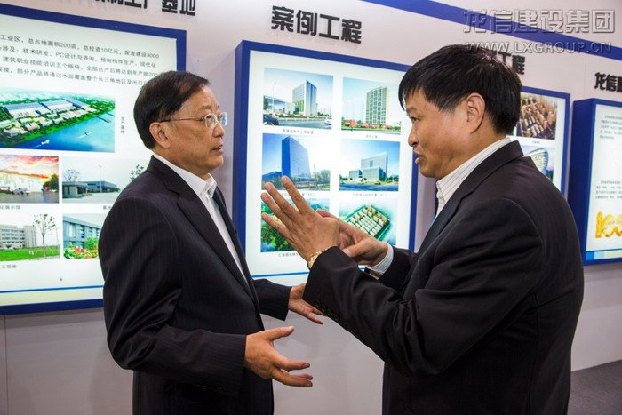 圖為陳祖新董事長向陳政高部長介紹龍信集團施工國內(nèi)首個公建產(chǎn)業(yè)化項目沈陽“十二運”安保指揮大廈,并就龍信集團的產(chǎn)業(yè)化發(fā)展模式與陳政高部長進行交流。